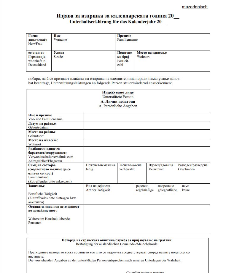 - Unterhaltserklärung за секое лице за кое аплицирате за издржување