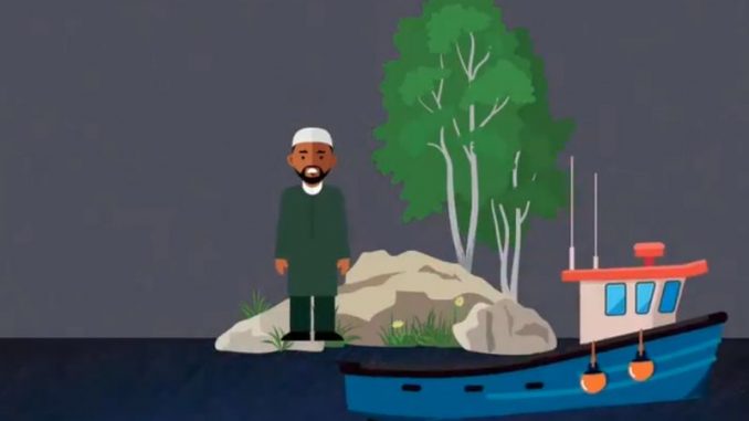 Во цртаниот се прикажува еден човек кој со брод се превезува на пуст остров.