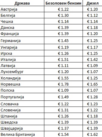 Сепак, имајте на ум дека во секоја држава можете да наидете на различни цени на гориво. Цените во табелата што следи се просек добиен од податоци од различни извори, како што се официјални владини веб-сајтови, сајтови на компании за гориво, коментари на потрошувачите и слично.