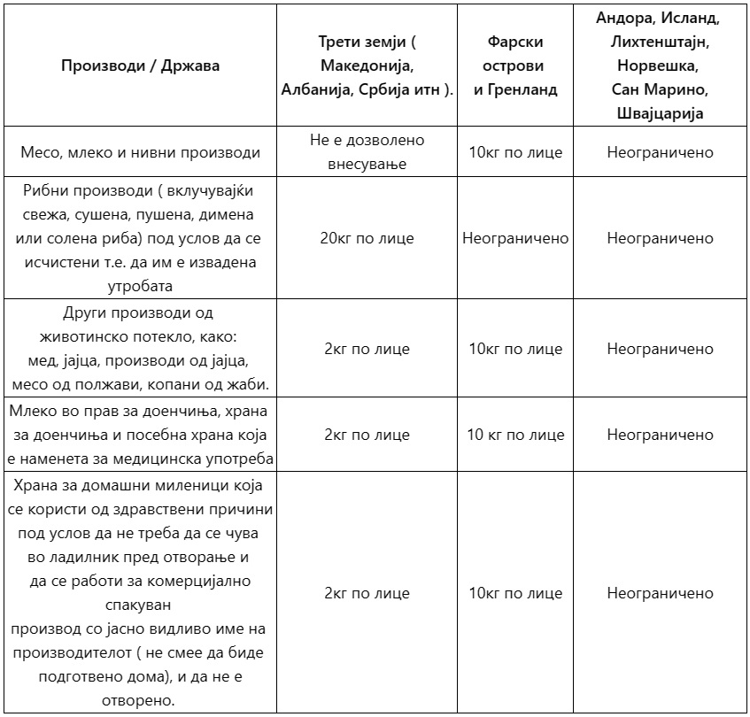 Многу патници кои патуваат од Македонија, , Албанија, Босна и Херцеговина, Србија, Црна Гора, Косово или некоја друга земја од трети земји, кога се враќаат во ЕУ, прашуваат колку месо и млеко можеме да пренесеме преку граница?