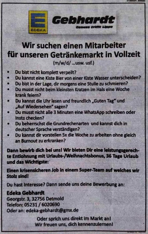 „Не сте целосно изгубени? Можете да замислите да работите петпати неделно без да страдате од согорување на работното место? Па, тогаш, јавете ни се!“ – пишува во огласот на комерцијалниот супермаркет „Едека“ во Германија.