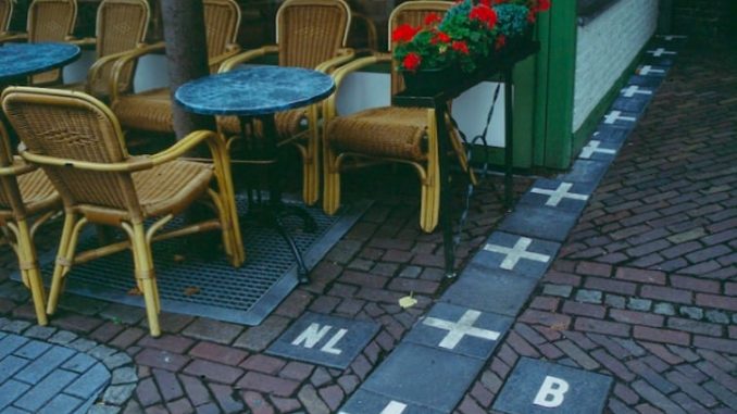 Границите се означени со бели крстови со „NL“ на едната и „B“ од другата страна