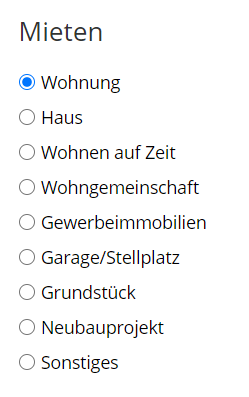 Во делот Was suchen Sie? едноставно изберете дали барате изнајмување, купување, изградба или друго. За изнајмување можете веднаш да изберете каков вид на објект барате, како што можете да видите на сликата подолу: